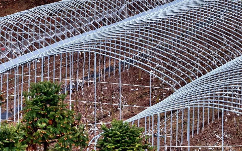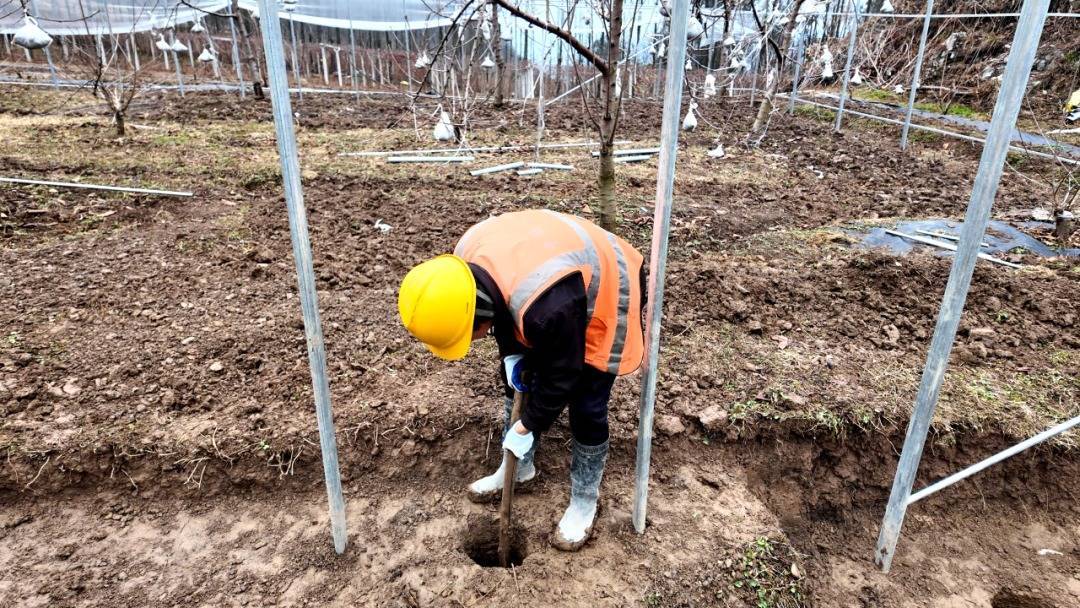 记者在现场看到,生果基地一派费事,工东谈主们正病笃施工,为车厘子树搭建大棚。